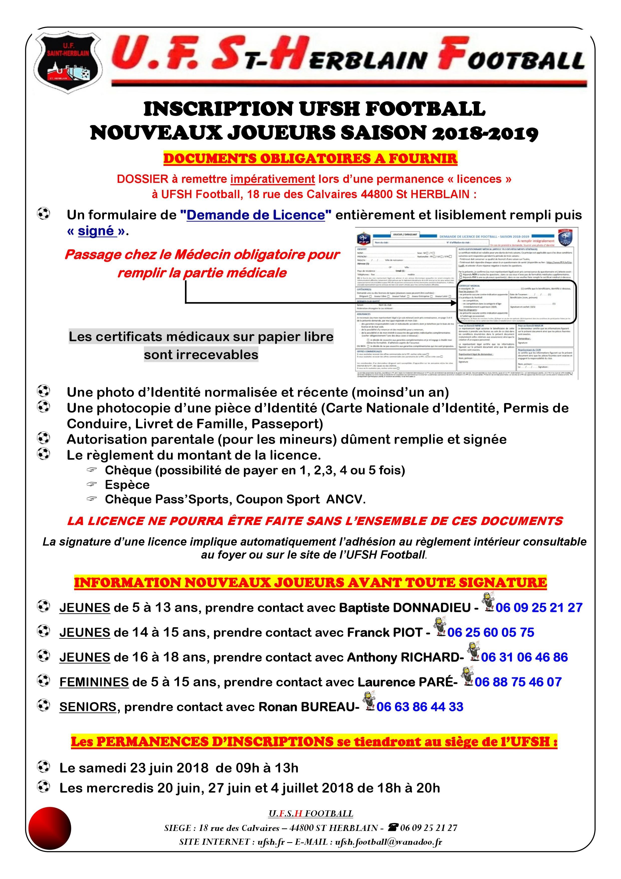Pour les nouveaux joueurs souhaitant rejoindre l'UF Saint-Herblain, merci de prendre contact avec le responsable de la catégorie concernée (voir ci-dessous les coordonnées). Seulement le responsable de la catégorie est apte à vous distribuer le dossier d'inscription pour la saison prochaine. (aucun dossier sera envoyé par mail ou courrier)